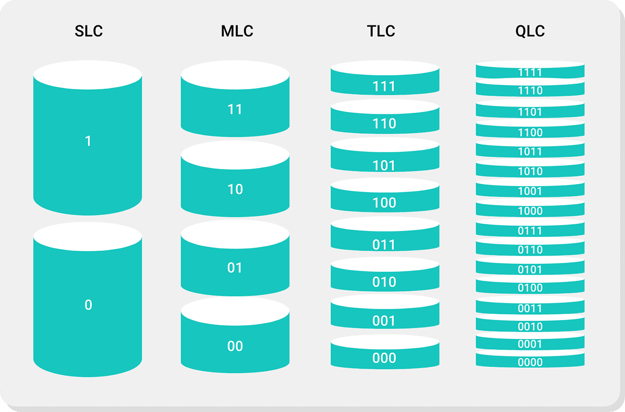 As flash storage became more sophisticated, engineers discovered how to add more bits to each memory cell. Multi-Level Cells (MLC) could store two bits and Triple-Level Cells (TLC) could store three.